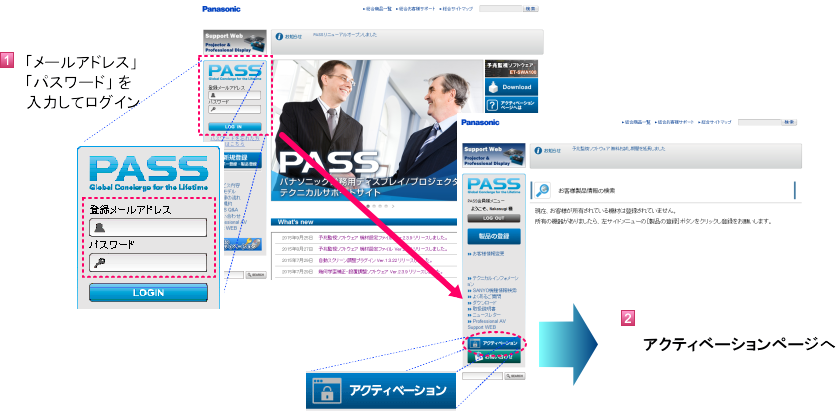 ソフトウェアおよびプロジェクターのアクティベーションコードを取得するには、PASSへ会員登録(無料) が必要です。 会員登録したあと、以下の手順で PASSへログイン し、アクティベーションページにアクセスしてください。